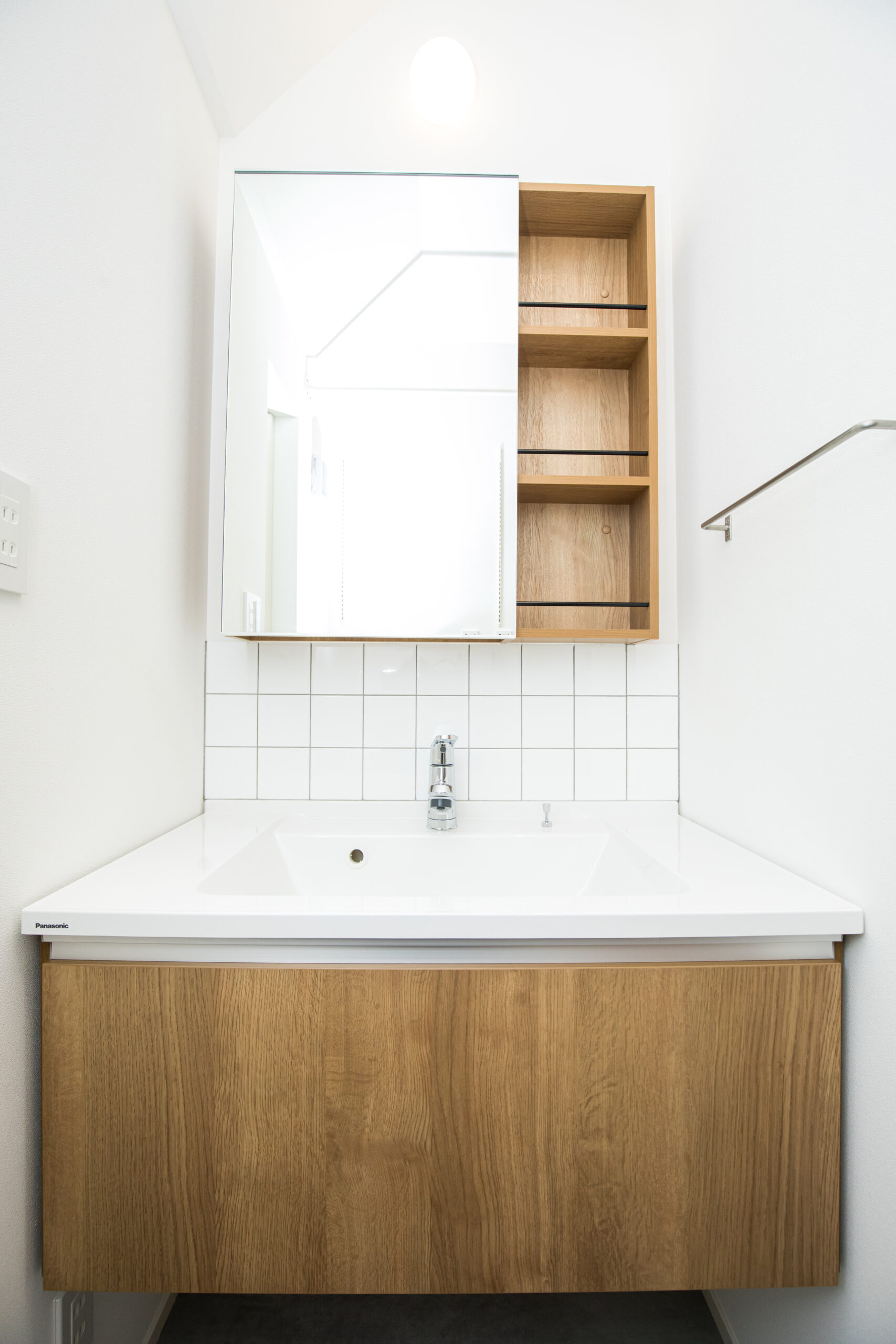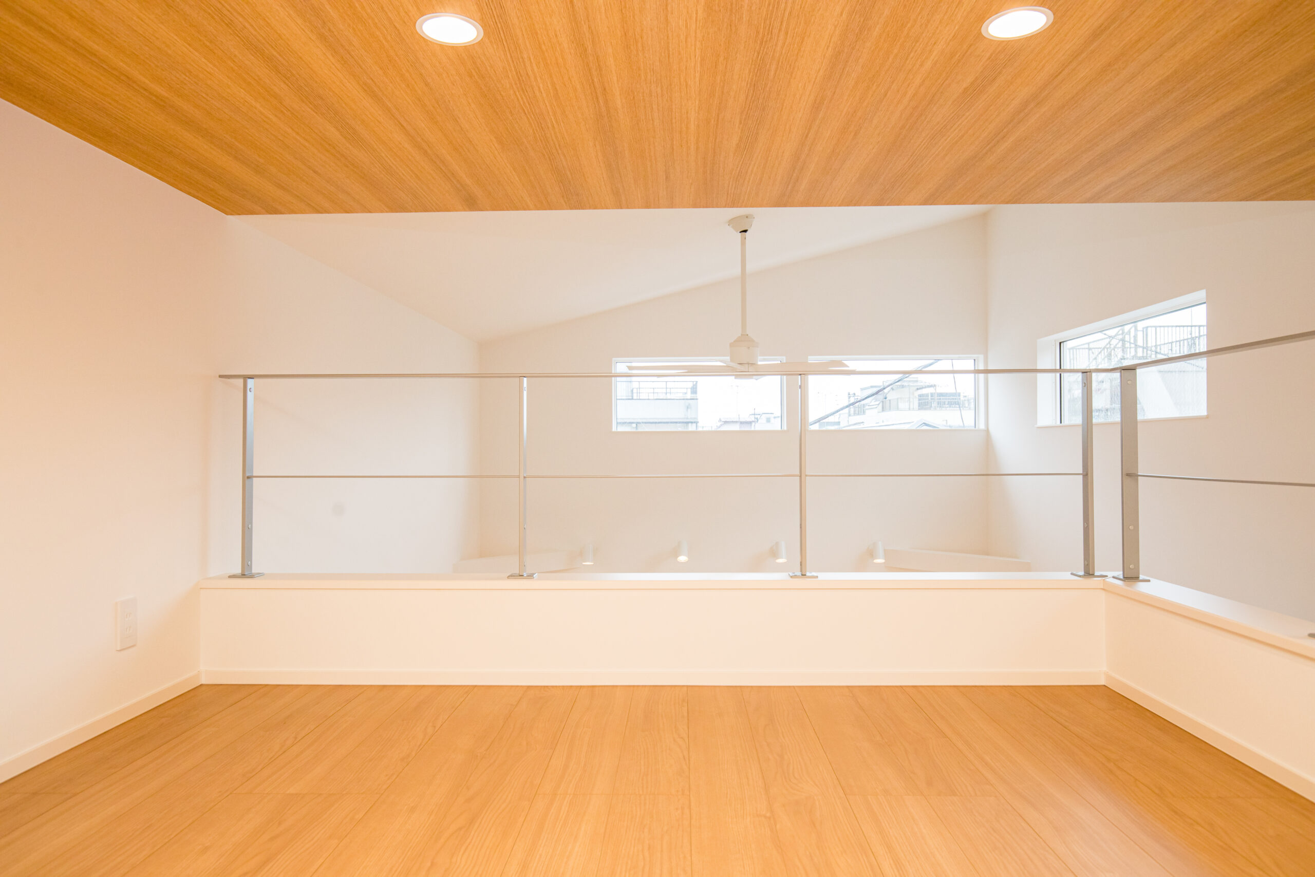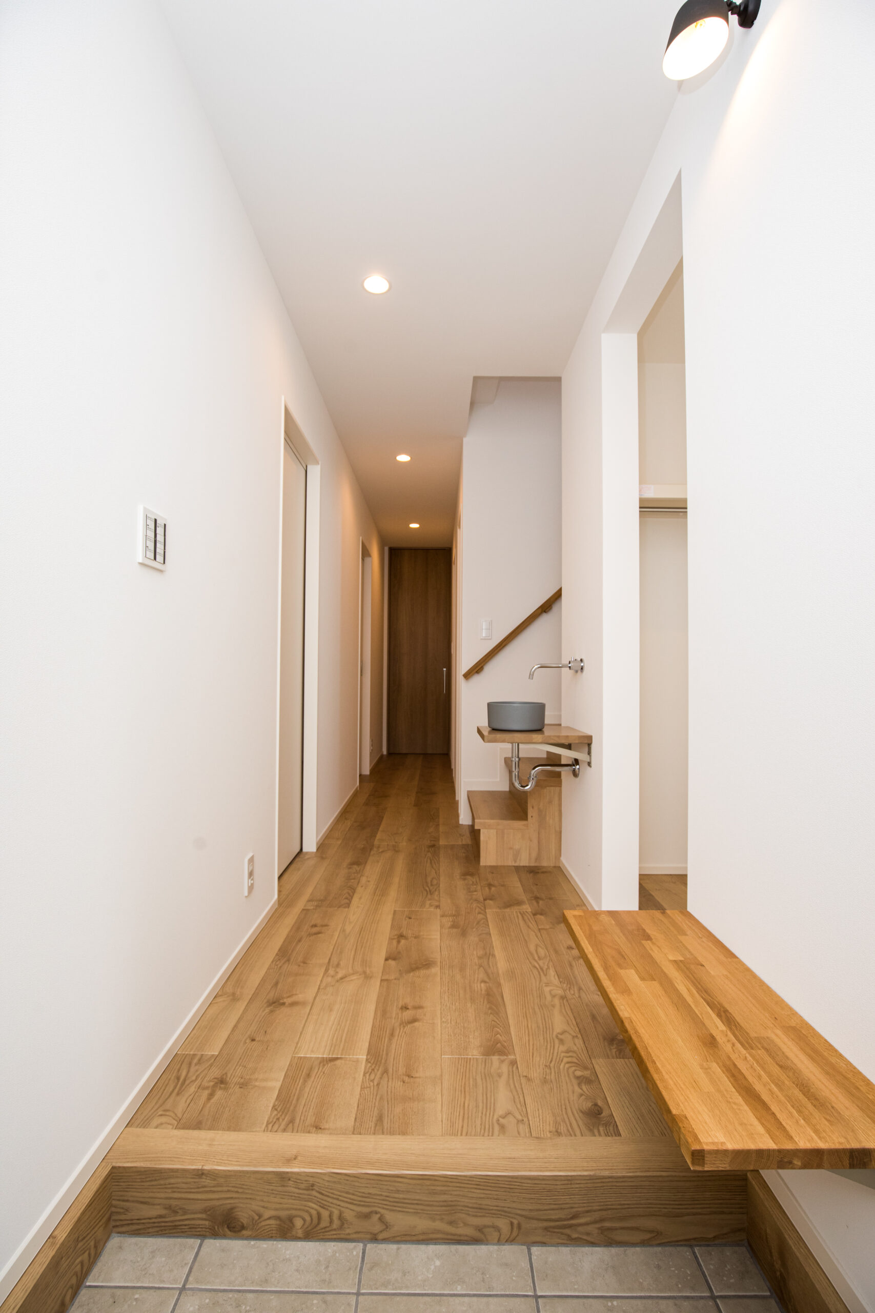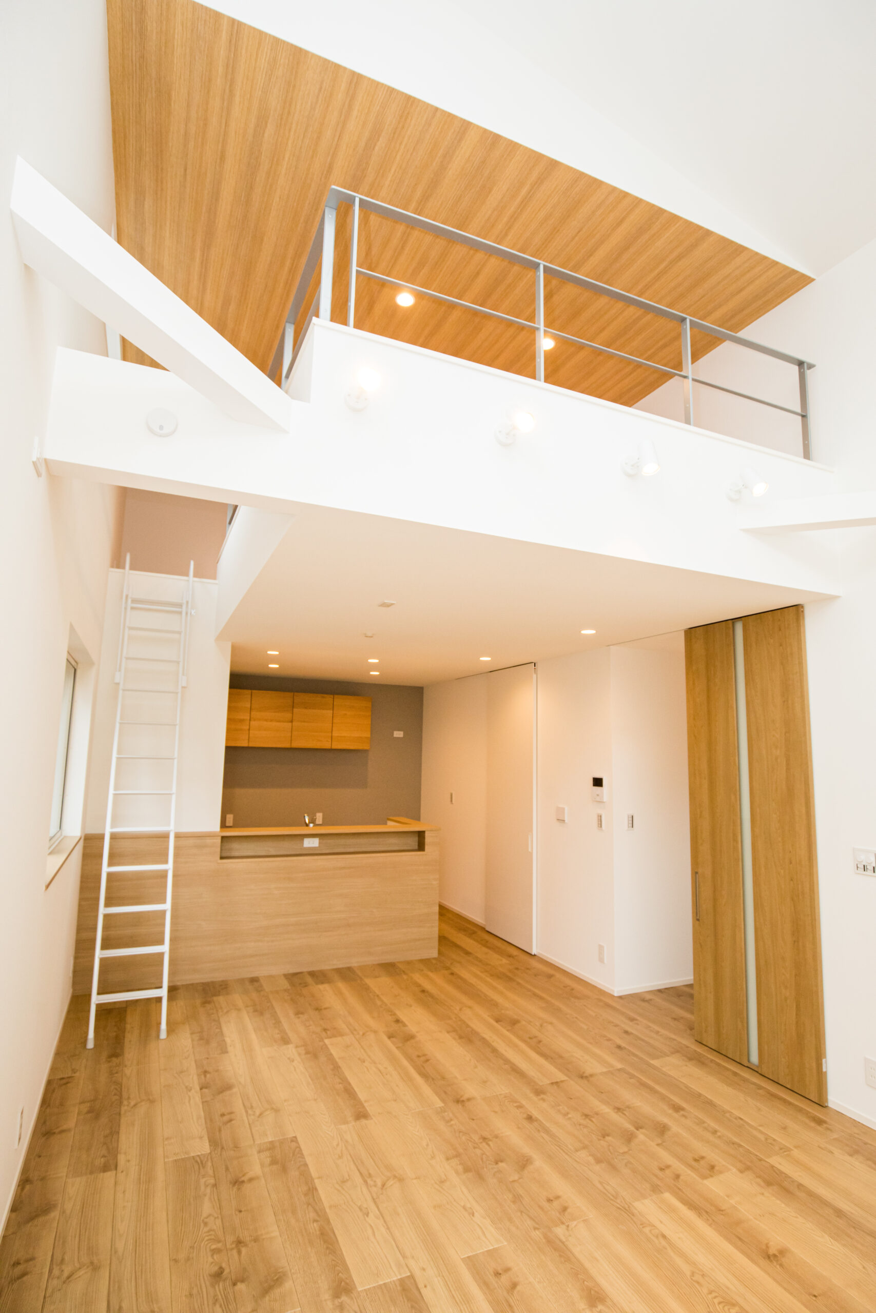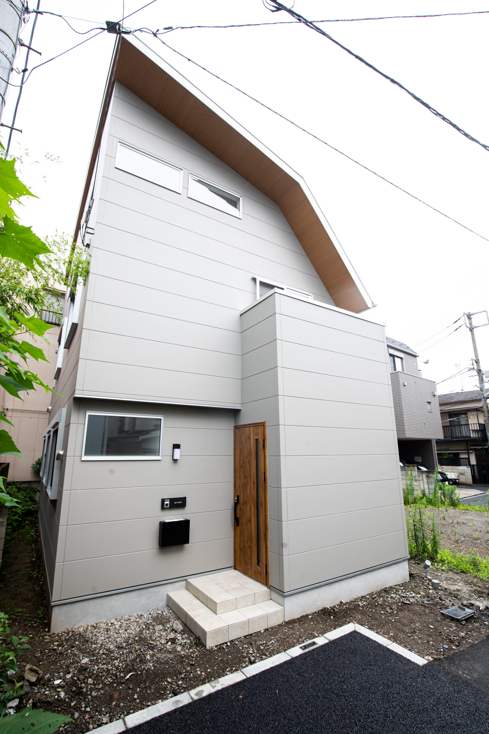 無機質と有機質を調和させた外観を提案、目地を生かしたデザインとなっている。無機質な外壁面と優しさのある木調の軒裏・玄関にてアクセントとした。エントランスにベンチ・手洗いを設ける等、機能的な要素を多く取り入れている。2階リビングにはダイニング上部まで迫り出す大きな多目的スペースを設計。天井に木調のデザインを取り入れ空間を引き締めている。吹き抜けは、2階LDKならではの屋根勾配なりに天井を上げ開放感のある空間とした。