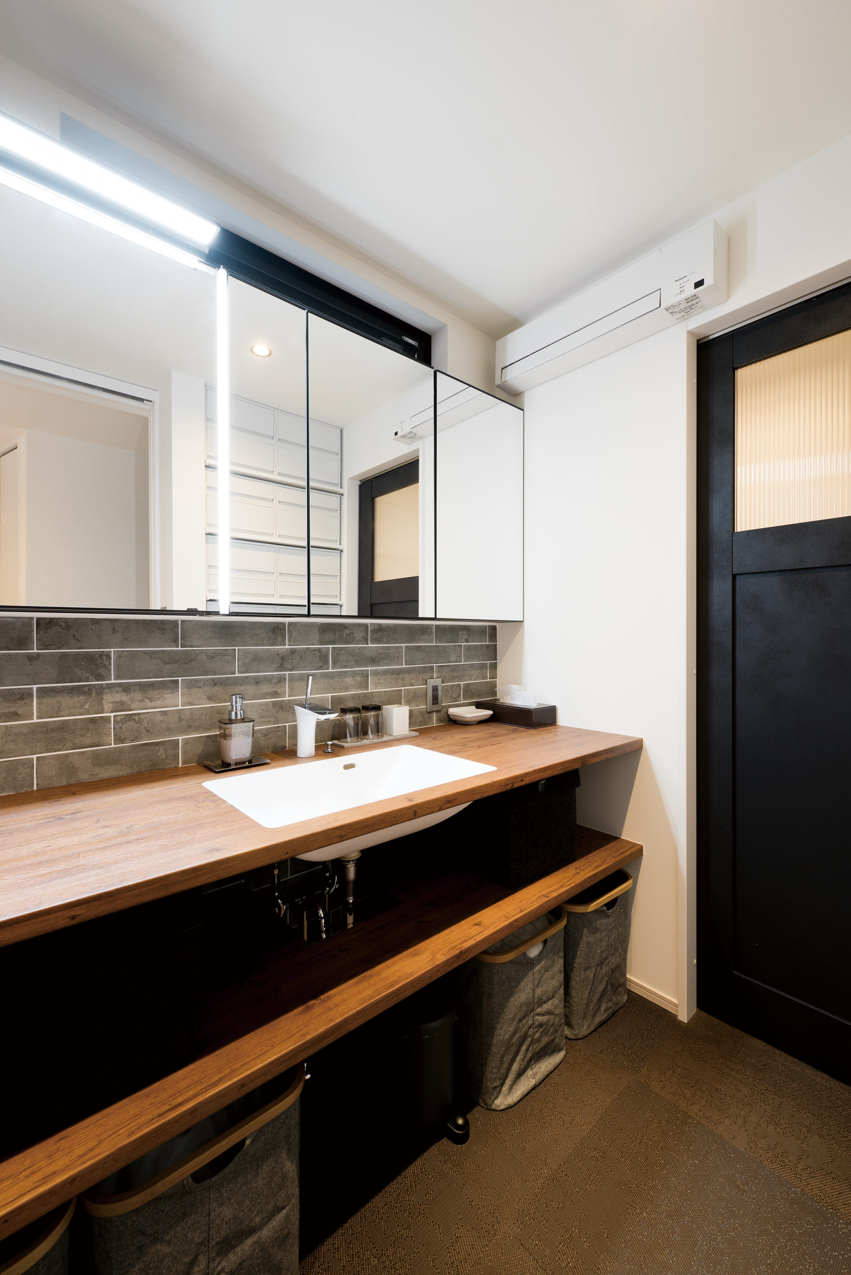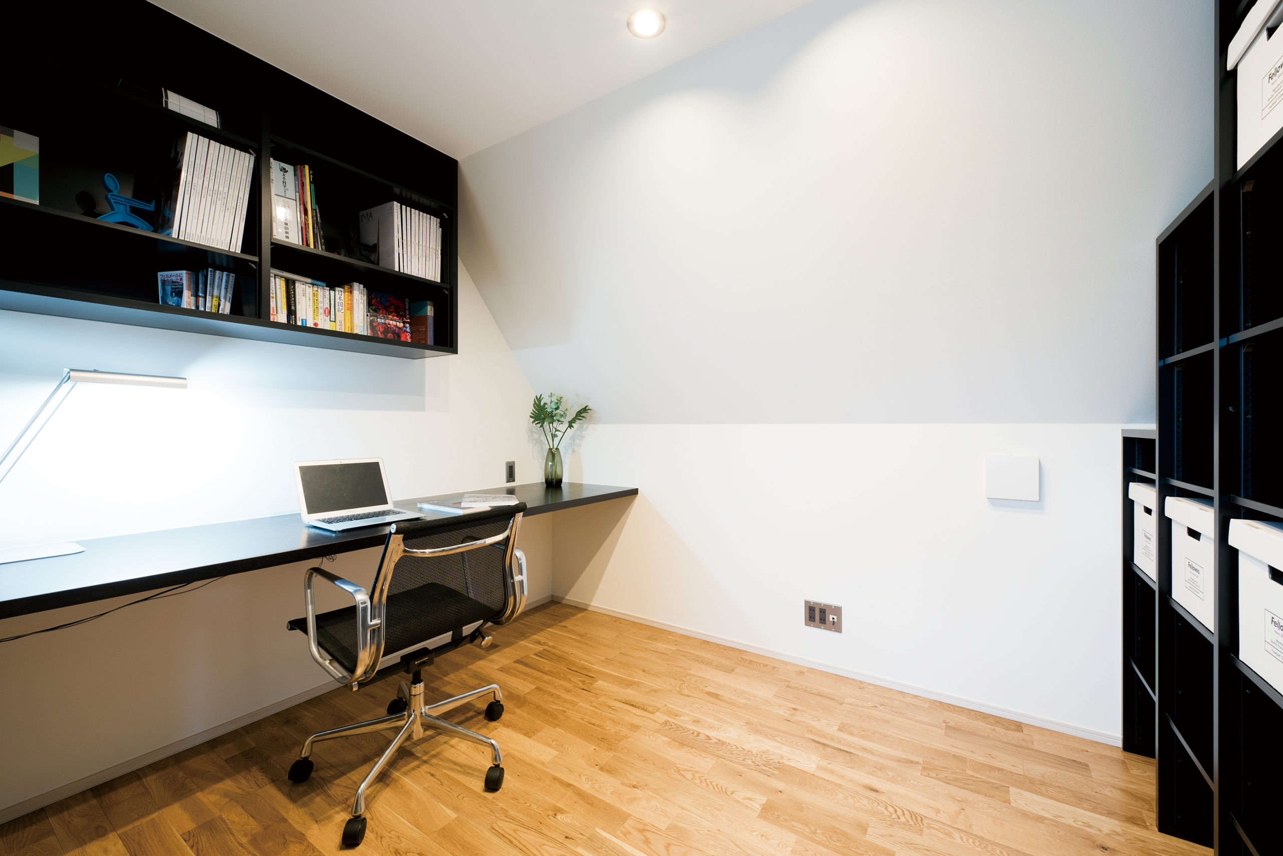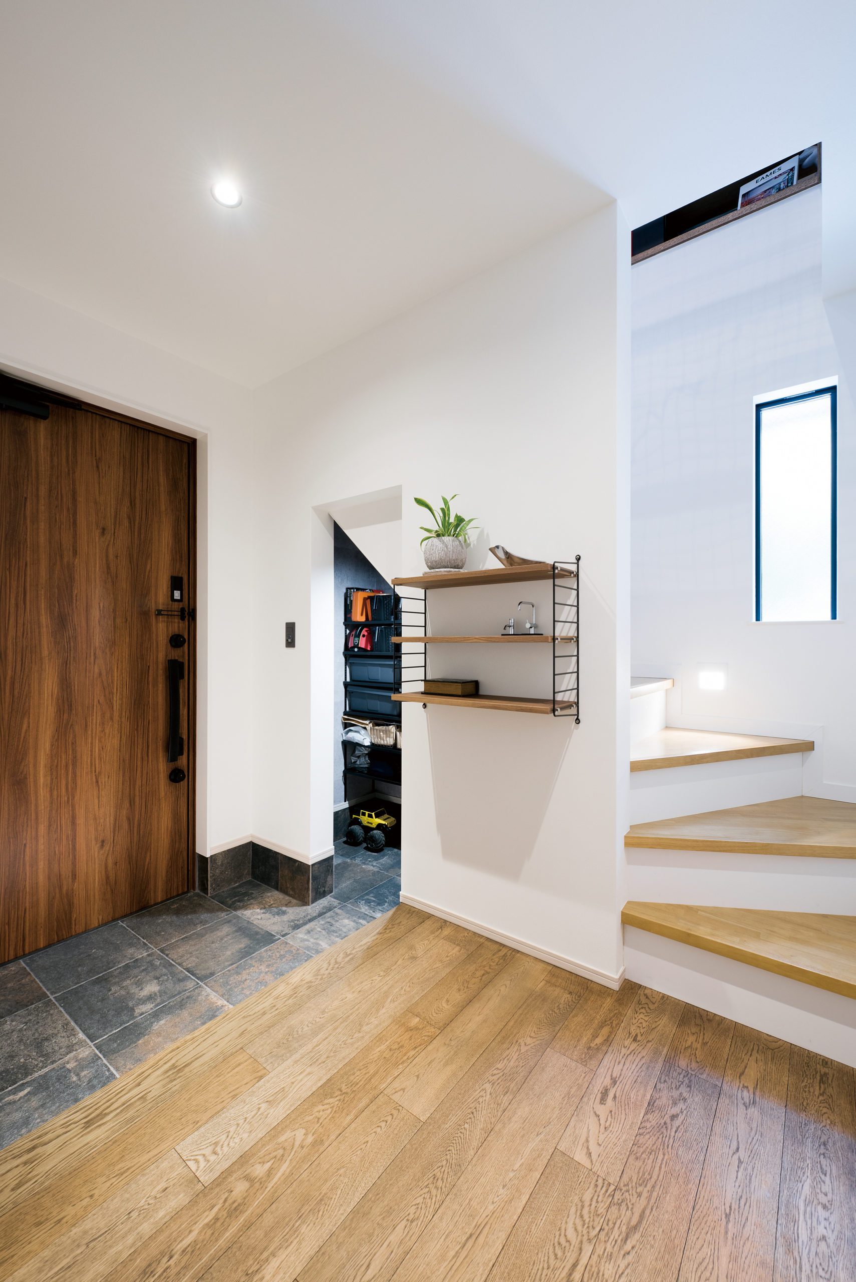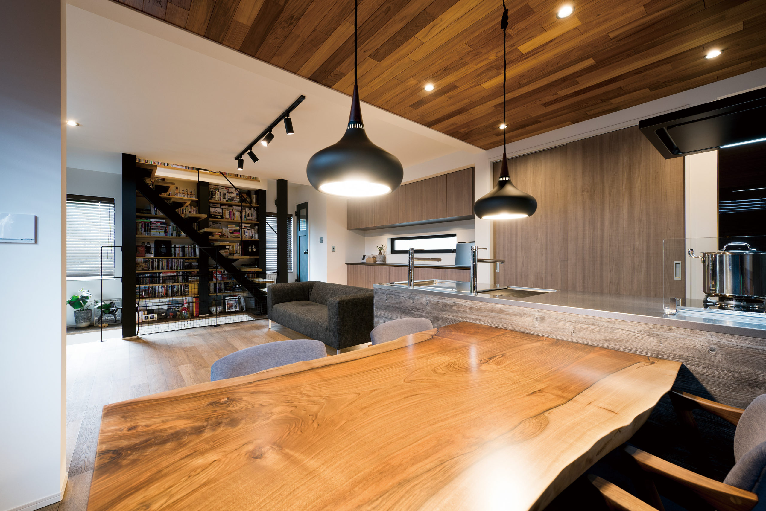 LDKの空間を最大限に活かした住宅。階段ホール・階段室を無くし、2階から3階へと続く壁面の本棚を設計。スケルトン階段と本棚を活かしたデザインを提案。キッチン・ダイニング上部にチーク材を設え、空間的にエリアを分けたデザイン。リビングから階段へと続く壁面には凹凸のある天然石を提案。キッチンにはペニンシュラタイプを採用。カップボードは引き違いの壁面収納内部に格納し、すっきりとしたキッチンとなった。玄関には間接照明を仕込み、来客をもてなすデザインとした。 シューズクロークにも取手のめだたない扉を採用し、シンプルな空間構成とした。3帖の洗面脱衣室には乾燥暖房機を設け、室内干しがいつでも出来るよう提案。洗面台上部にハイサイドの窓を設け、照明無しでも明るい洗面室とした。